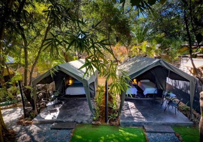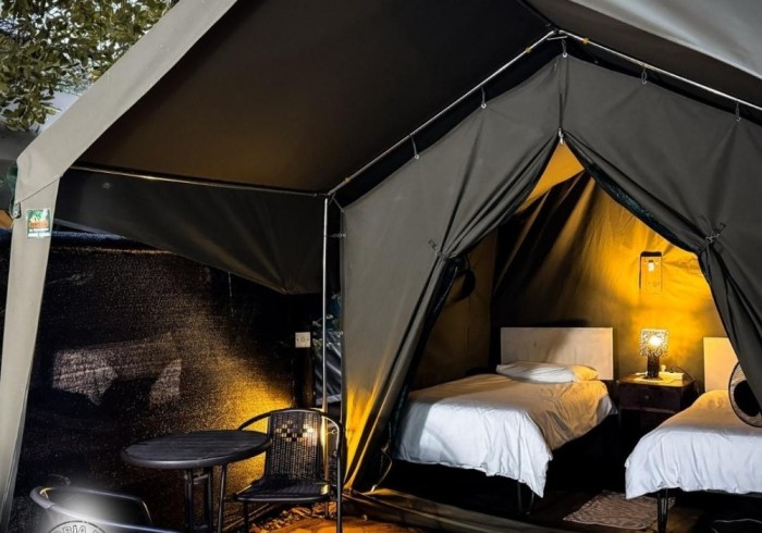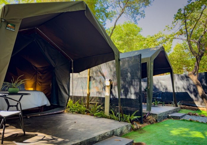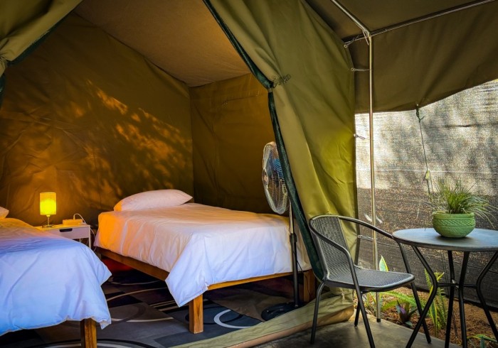 Twin bed Safari tent with separate shared bathrooms. Includes two twin beds, fresh lines, mosquito nets, fan and free Wi-Fi. Guests can enjoy the pool area, self-catering kitchen, Braai Boma area and the lounge with a TV and some games. We also have a Spa and Activities desk.